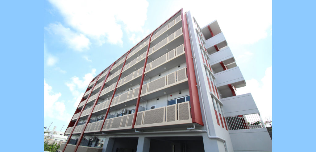 【企画物件実績】アンビシャスシリーズ沖縄市美里『リバース宮里』 企画物件の実績紹介2(2011〜2017)2015年完成 投稿日| 2020.11.13 最終更新日| Ambitious【リバース宮里】 建物名称 Ambitious【リバース宮里】 住所 沖縄市美里 構造 壁式鉄筋コンクリート造(RC造) 階数 6階建て 総戸数 28戸 土地面積 951.84㎡ 延床面積 1,301.88㎡ 完成年月 2015年 9月